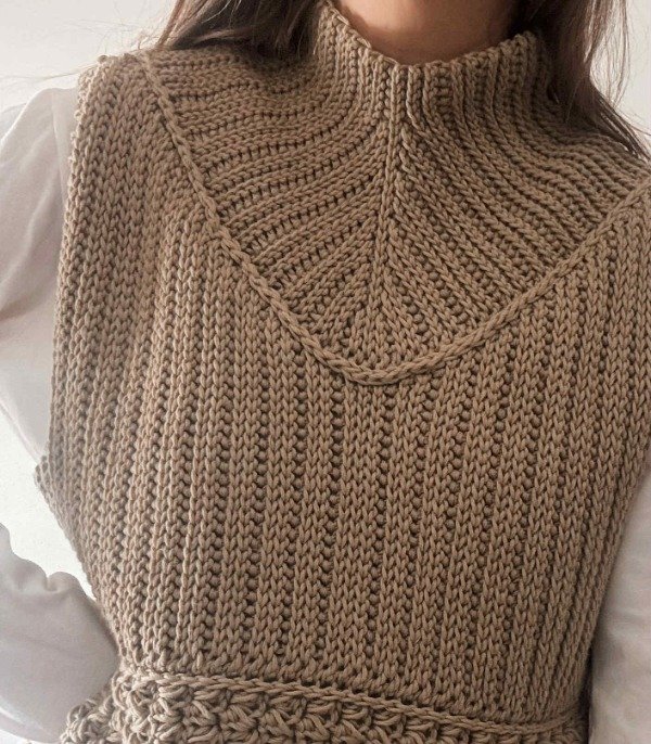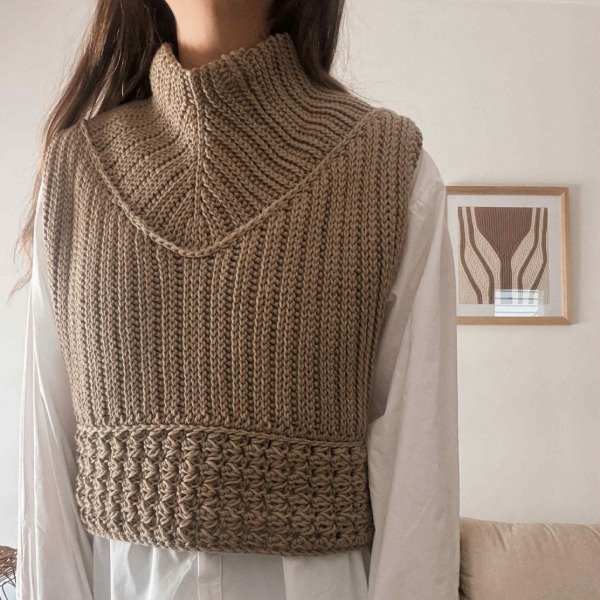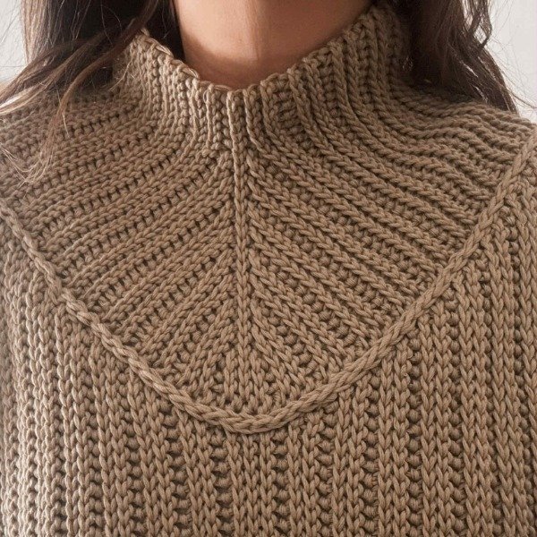 Este proyecto se teje a crochet, desde el cuello, que es el gran protagonista, hasta la guarda final. En su mayoría se teje en vertical, y al final, en horizontal. Tiene una trama sencilla de solo 4 vueltas que se teje de manera repetitiva, formando el cuello, con vueltas cortas, y gran parte del cuerpo. Para terminar, se realiza una terminación en el espacio de las mangas y una guarda inferior con una trama distintas.