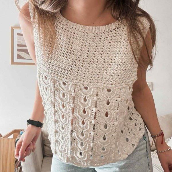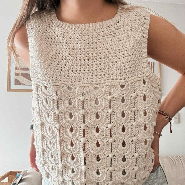 Tiene 2 estructuras para trabajar, según el proyecto que tengas ganas de tejer: musculosa o sweater de media estación.