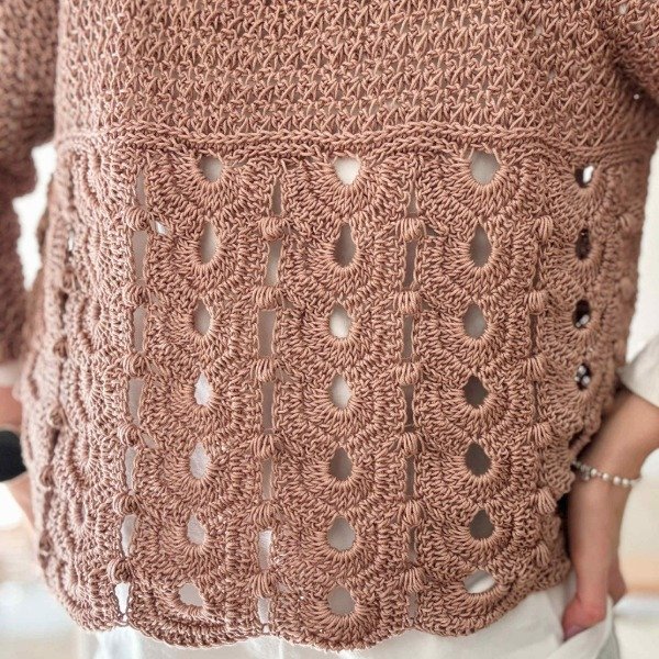 Este proyecto se teje a crochet, desde arriba hacia abajo, en horizontal. Tiene 2 tramas con puntos básicos, que se tejen de manera repetitiva, lo que lo hace un proyecto fácil de seguir.